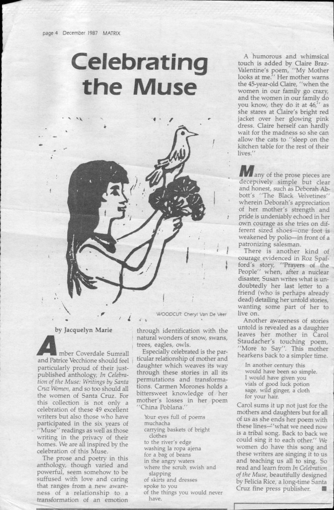 Article on Anthology In Celebration of the Muse: Writings by Santa Cruz Women, December 1987