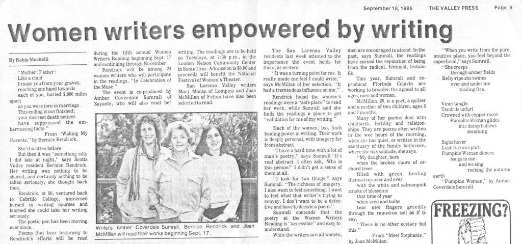 An interview with Amber Coverdale Sumrall, Bernice Rendrick, Joan McMillan, The Valley Press, September 18th, 1985