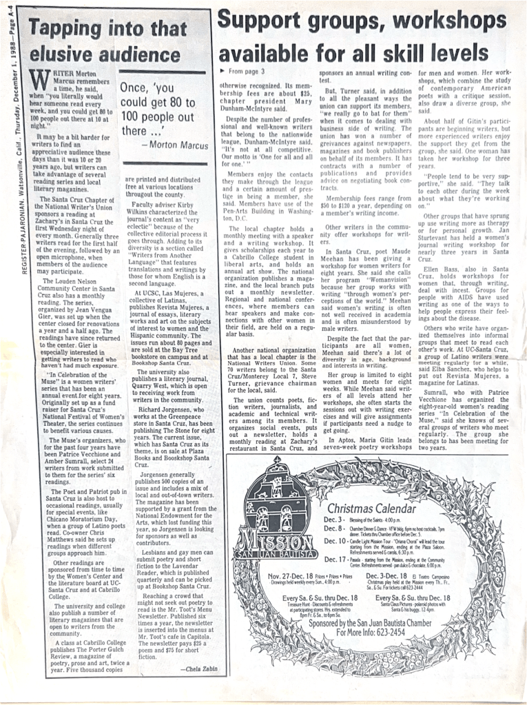 Article on Santa Cruz Writers and In Celebration of the Muse, The Pajaronian, December 1st, 1988