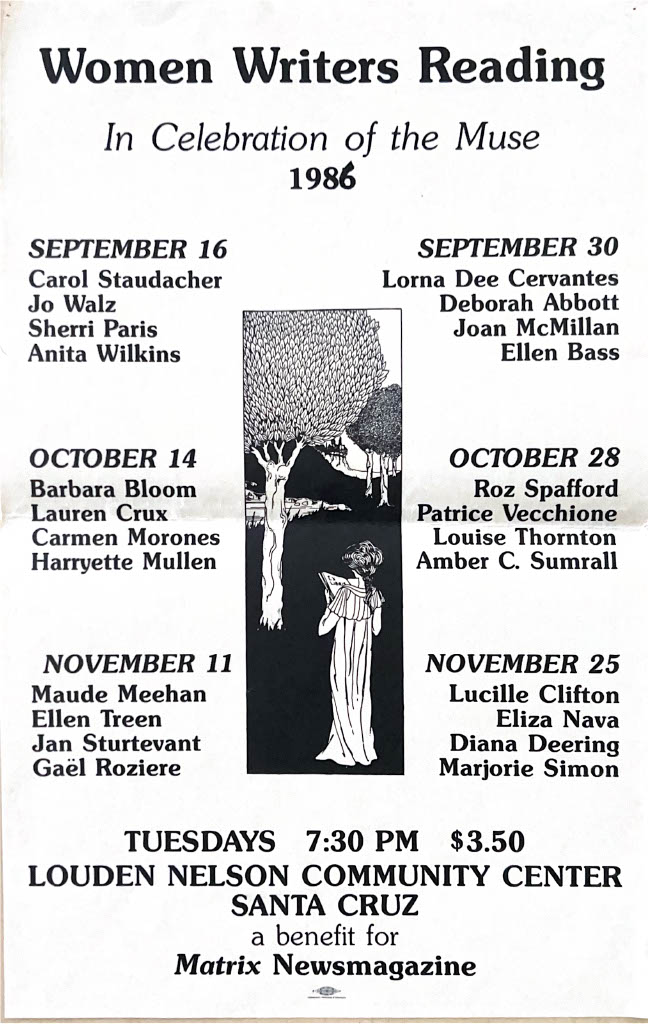 Mentioned: Veronica Heath, Brian Pusser, Morton Marcus, Patrice Vecchione, Amber Coverdale Sumrall, Mary Dunham-McIntyre, Maude Meehan, Maria Gitin, Ellen Bass, Elba Sanchez, Richard Jorgensen, Jean Vengua Grier, Chris Matthews, Kirby Wilkins