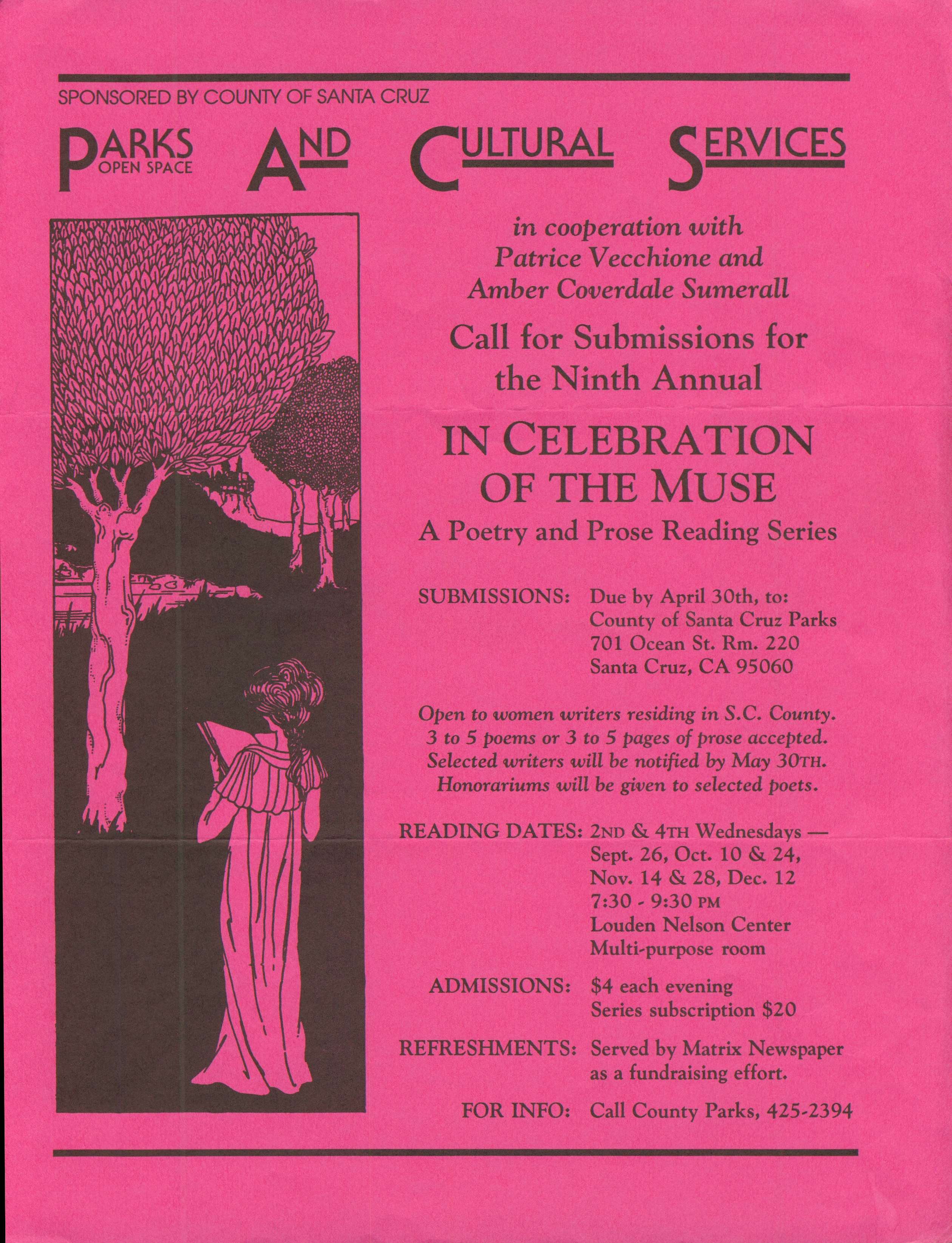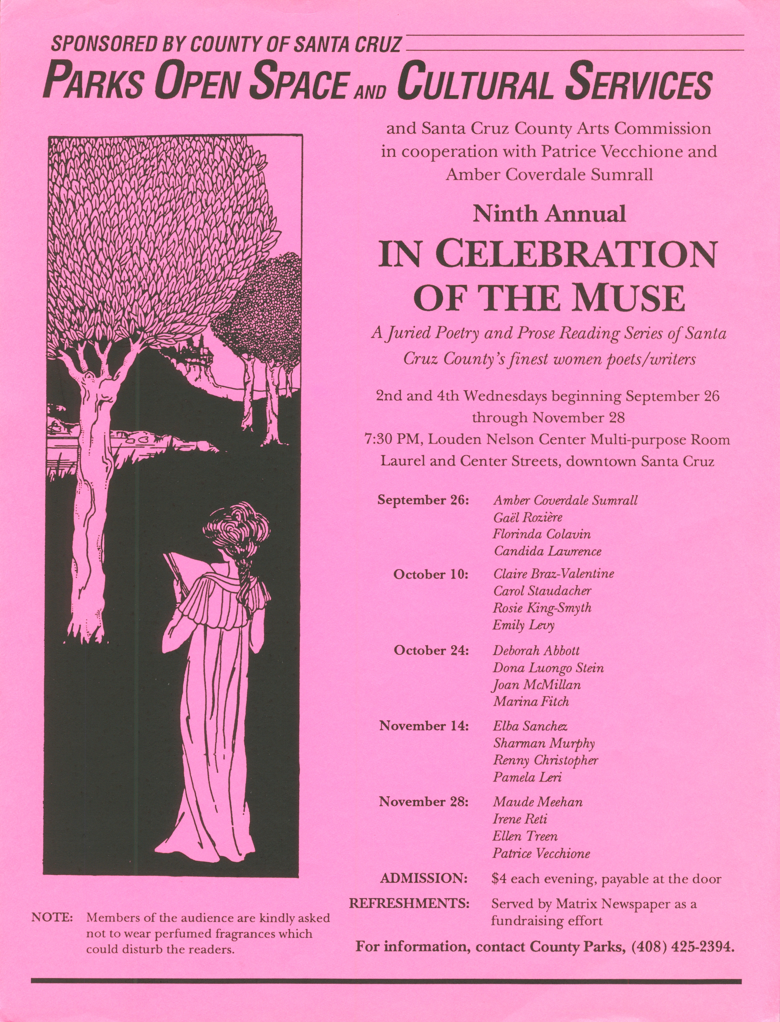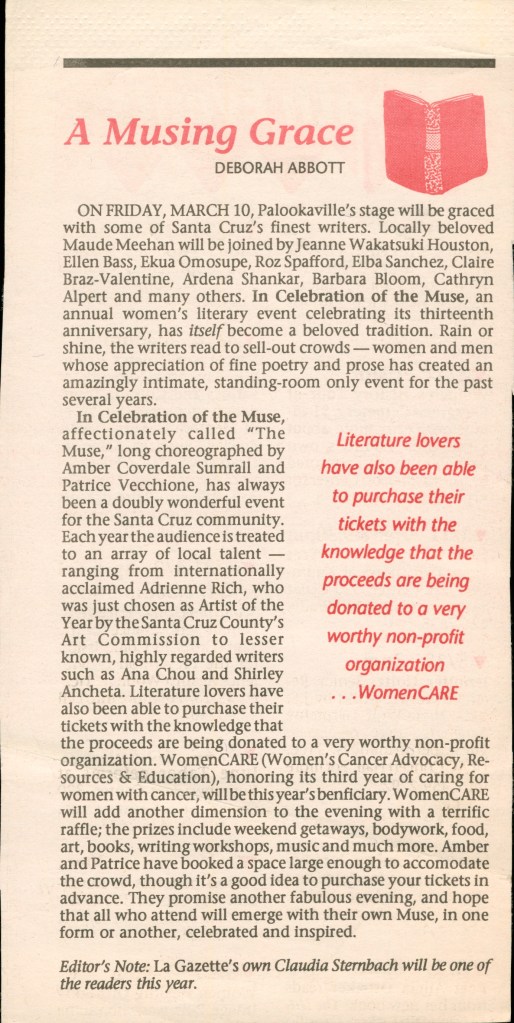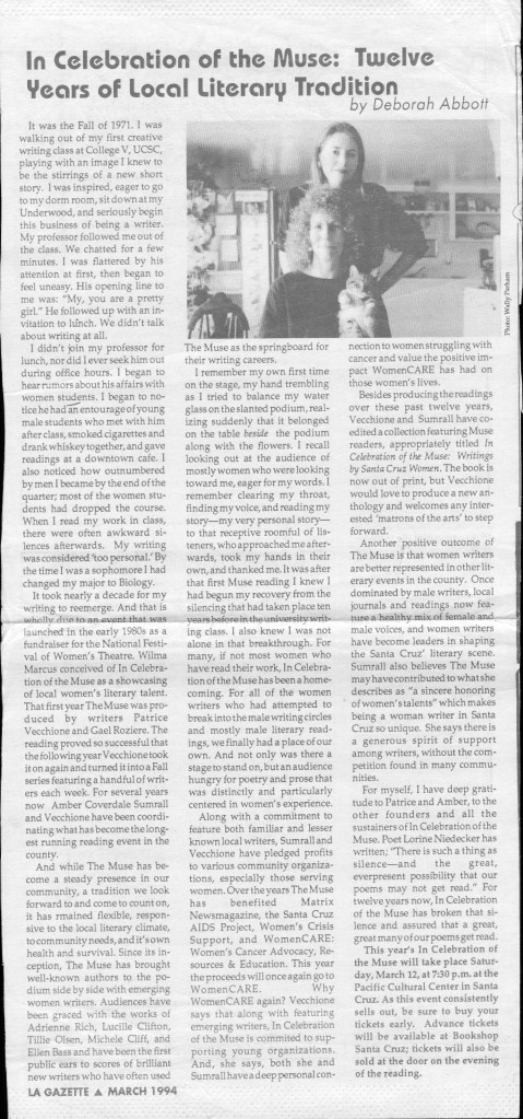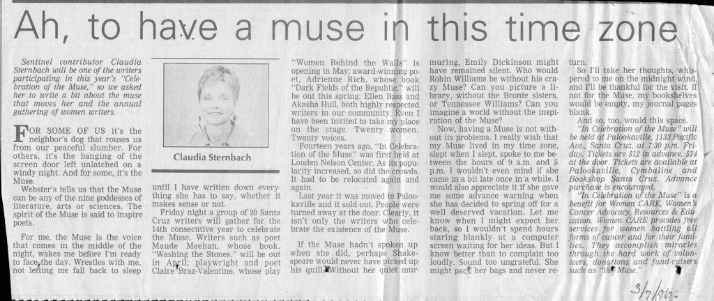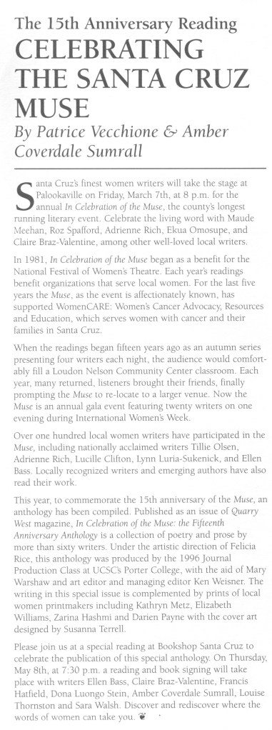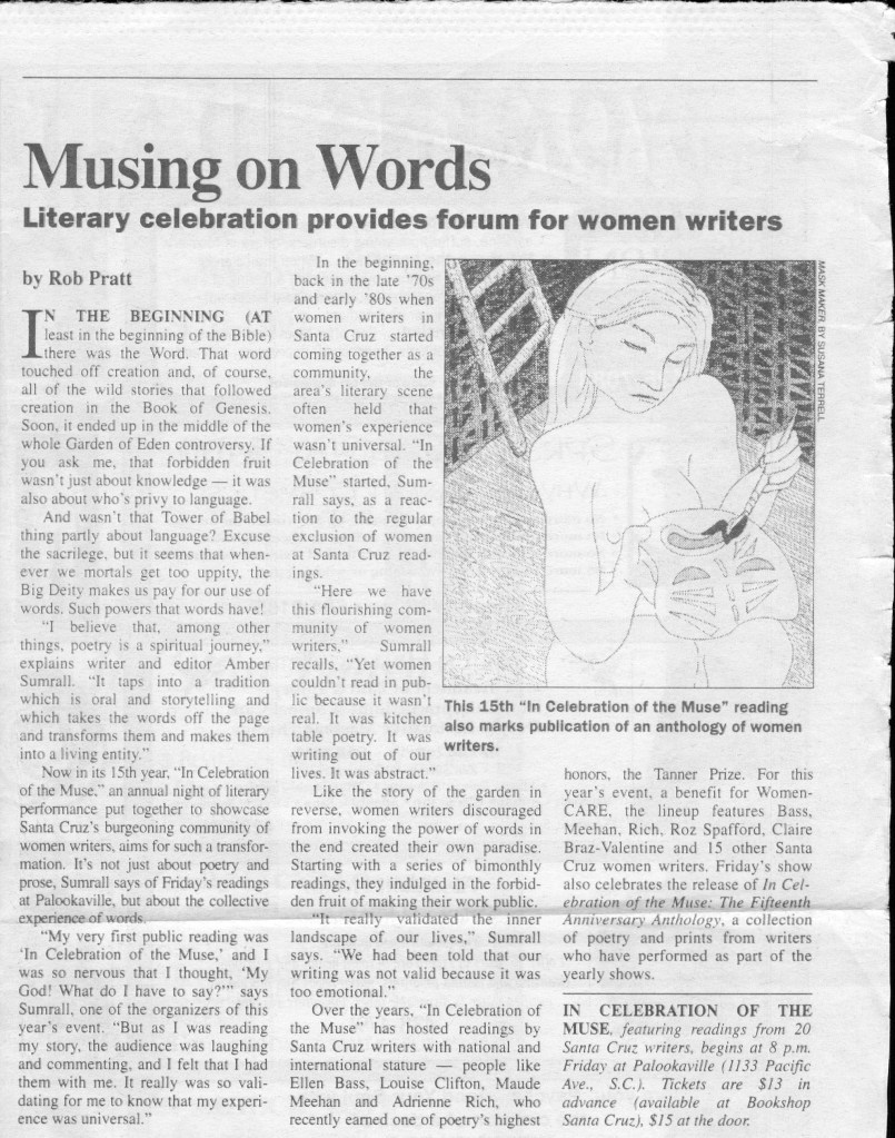 Article on the 14th annual In Celebration of the Muse, Santa Cruz Sentinel, March 16th, 1996