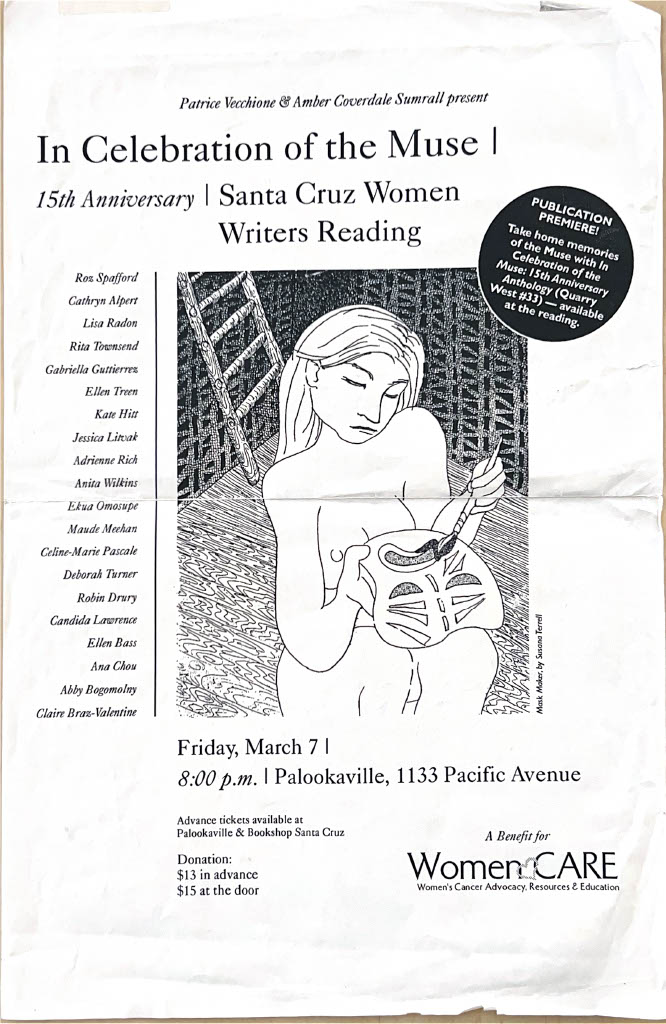 Mentioned: Amber Coverdale Sumrall, Patrice Vecchione, Adrienne Rich, Maude Meehan, Claire Braz-Valentine, Roz Spafford, Ekua Omosupe, Tillie Olsen, Lucille Clifton, Lynn Luria-Sukenick, Ellen Bass, Ken Weisner, Kathryn Metz, Elizabeth Williams, Zarina Hashmi, Darien Payne, Susanna Terrell, Francis Hatfield, Dona Luogo Stein, Louise Thornston, Sara Walsh